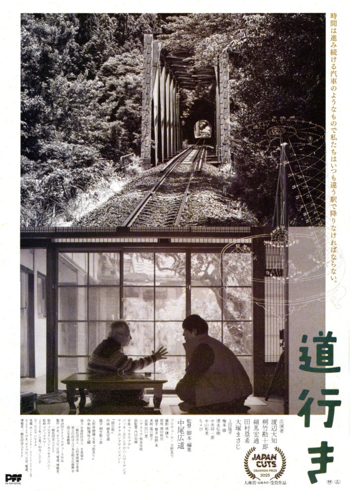 映画のタイトルになった「道行き」(道行)には、いろいろな意味がある。文字通り「道を行く」というのはもちろん、歌舞伎や文楽では男女が連れ立って旅をする。それも、許されぬ恋のため心中をするという物語などで使われる。文楽の人形遣いで人間国宝である三代目・桐竹紋十郎が、初めて「俳優」として出演しているとあって、勝手に悲劇へ向かう作風を想像していたが…。これは、ある青年が大阪から奈良の御所(ごぜ)市へと「違う土地に移住」するということと、それによって「現代」から「懐かしい昔」へ時間を遡るという、ある意味での「時間の移ろい」のダブルミーニングにもなっている。